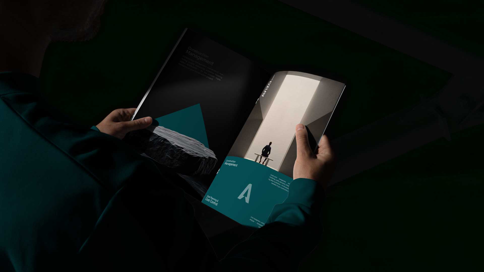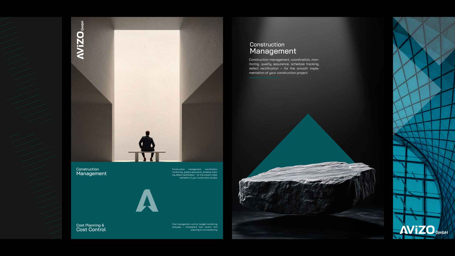 The visual system builds on this foundation through a refined palette of deep teal, black, and neutral tones, creating a professional and confident presence. Angular shapes and directional compositions echo architectural forms and structural frameworks, reinforcing the brand’s connection to construction and engineering.