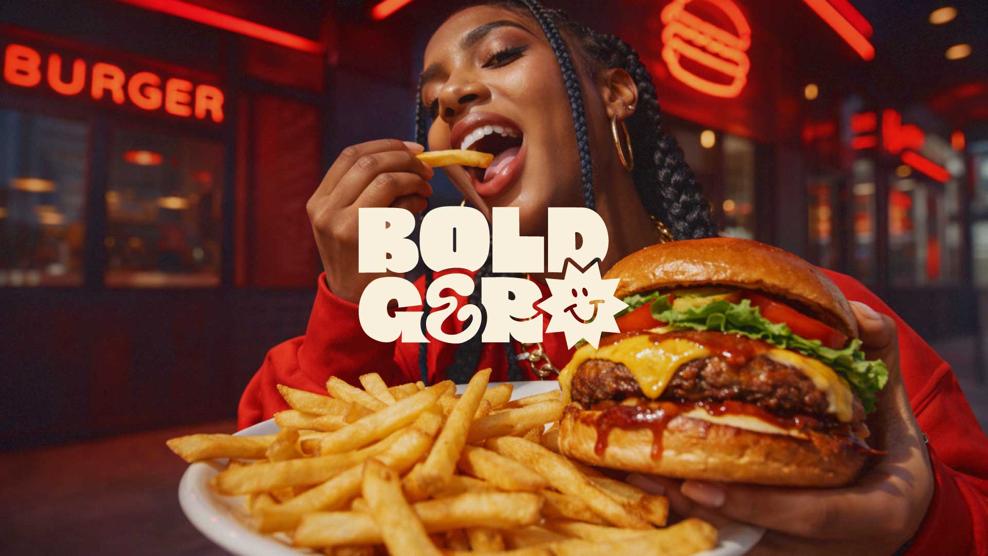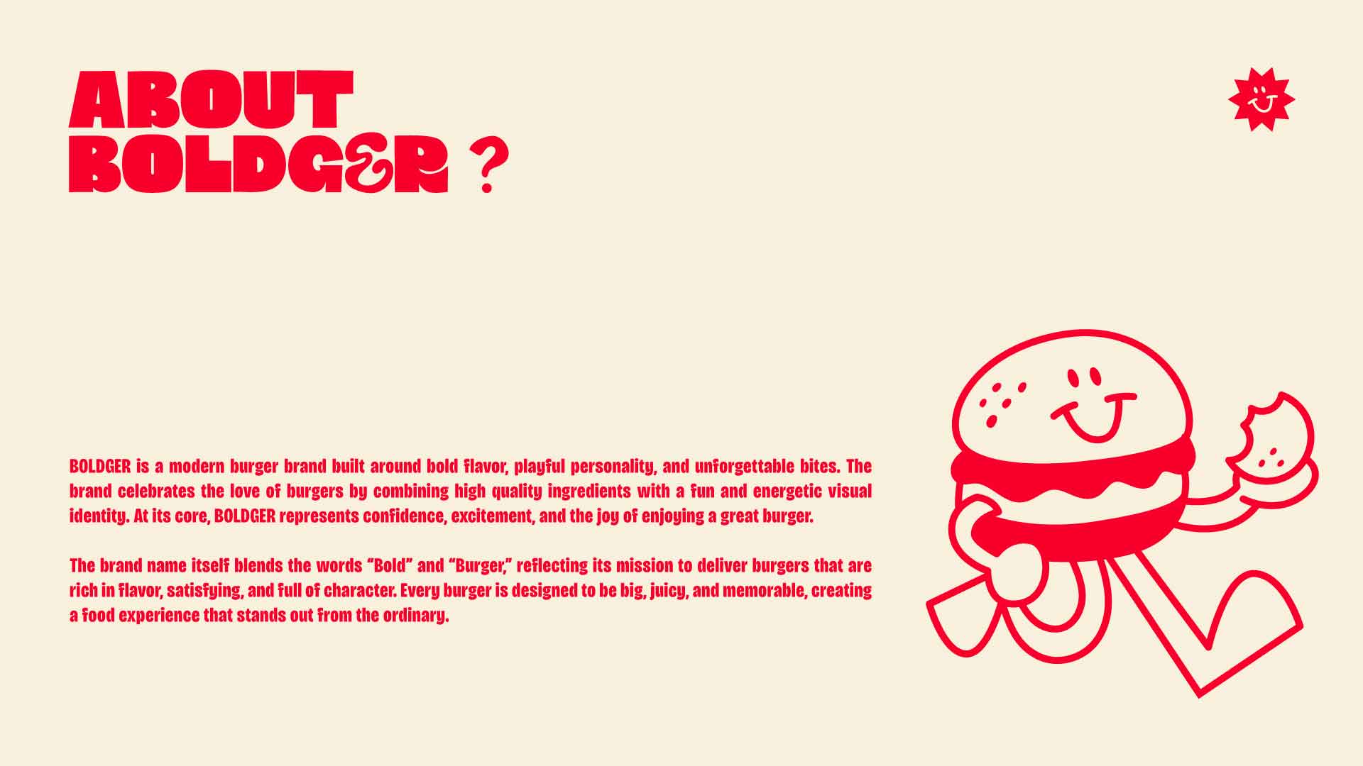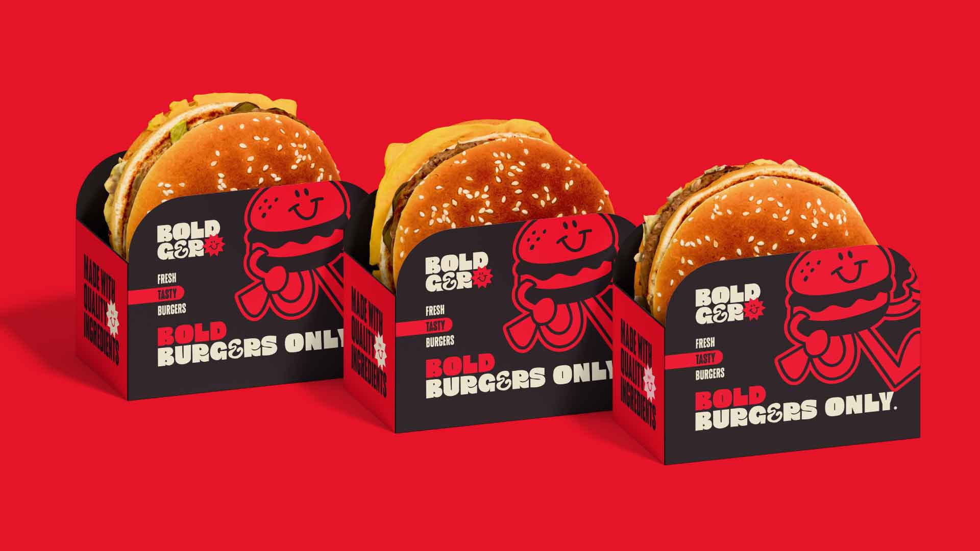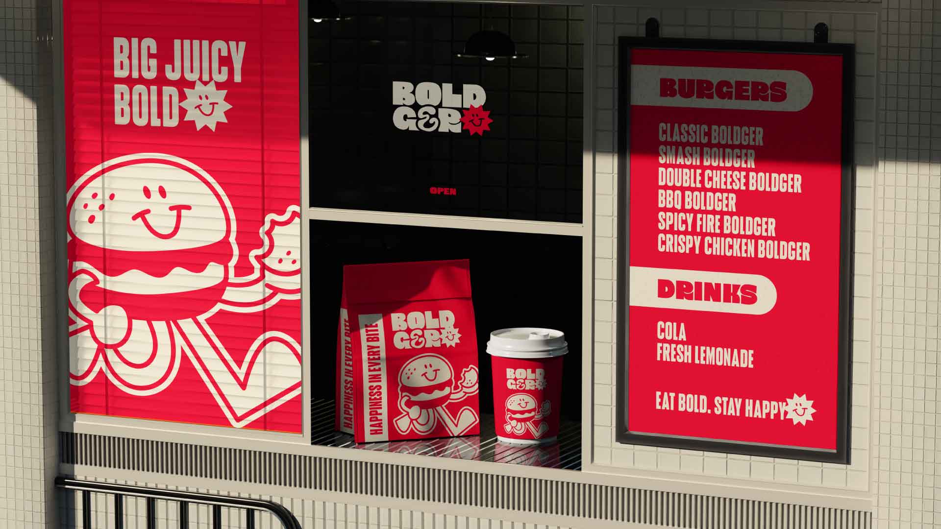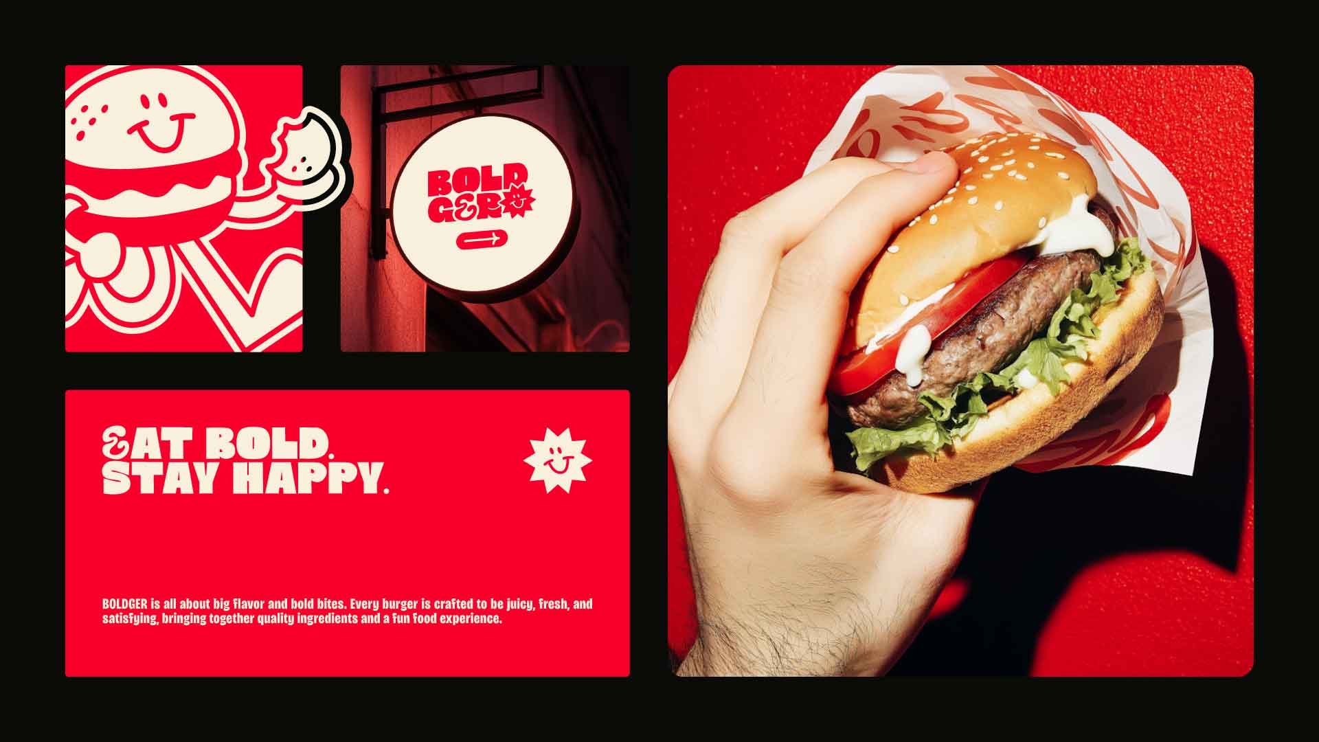 The Boldger packaging system is designed to capture attention instantly while reflecting the brand’s fun, energetic personality. Built around a striking red and cream color palette, the visuals create strong shelf impact and reinforce a sense of boldness, appetite appeal, and consistency across all touchpoints.
