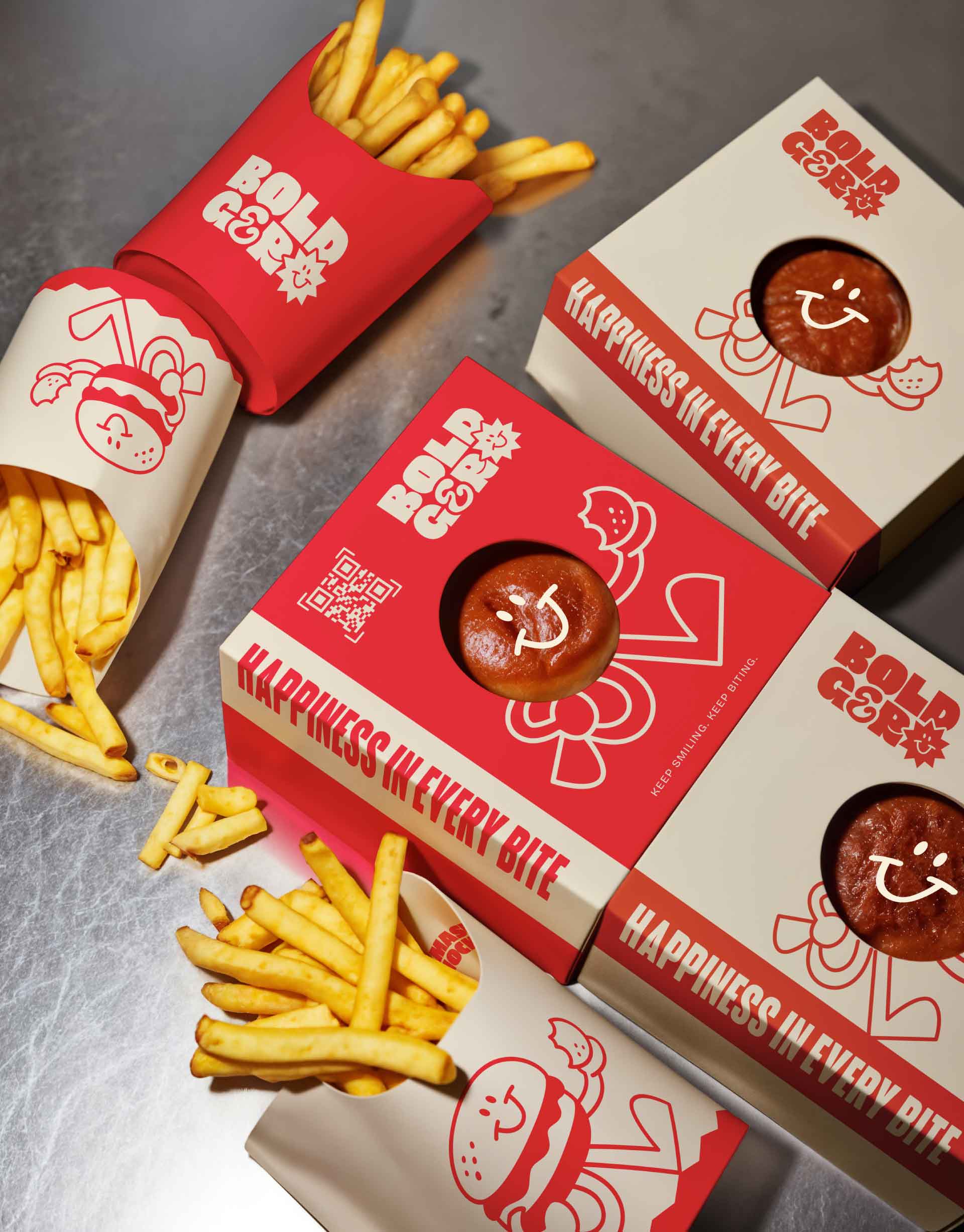 From burger boxes and fry sleeves to takeaway bags and drink cups, every element is unified through a cohesive visual language that balances clarity with personality. The result is a vibrant, modern packaging system that stands out, feels distinctive, and brings a sense of delight to the everyday fast-food experience.