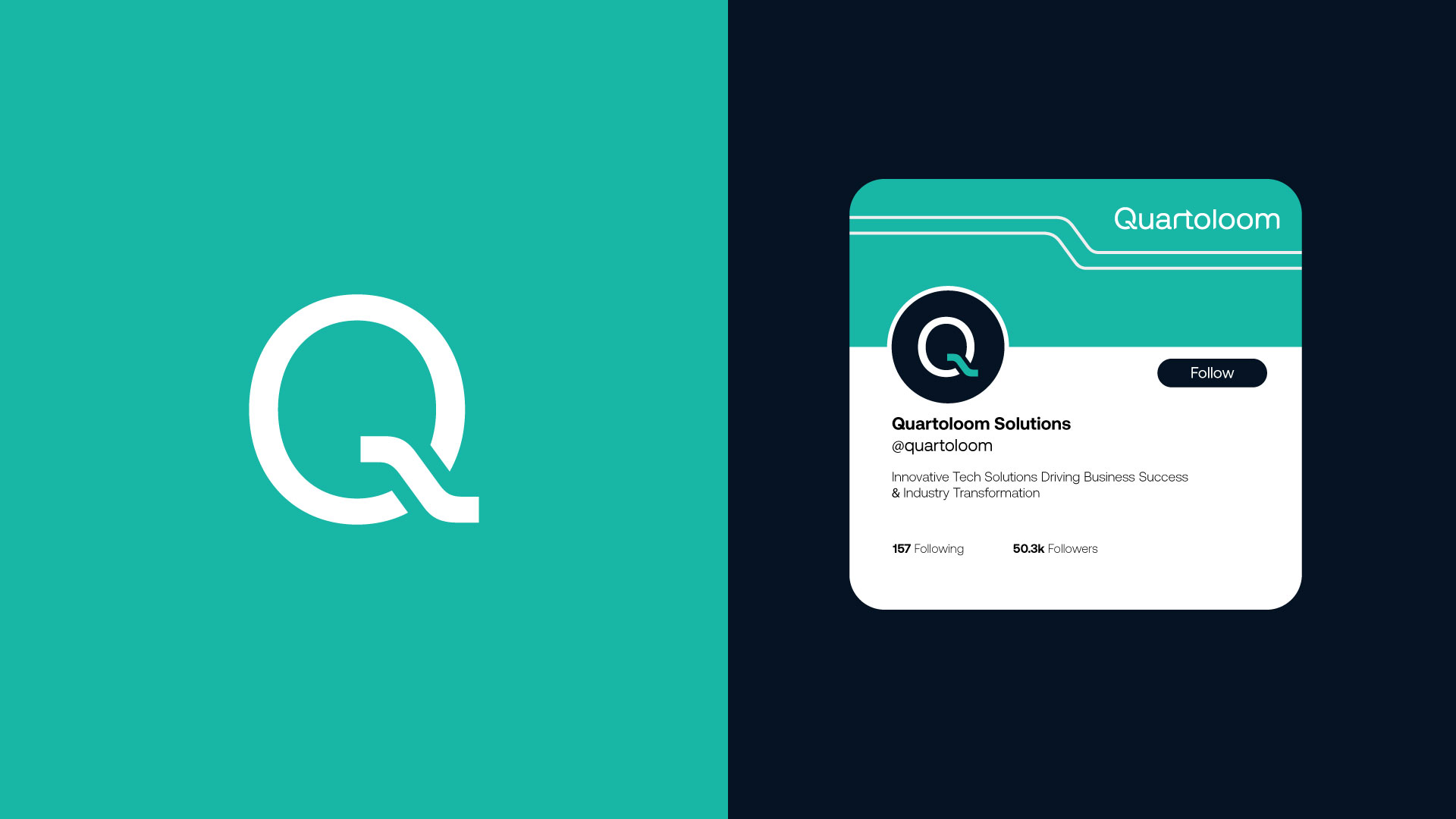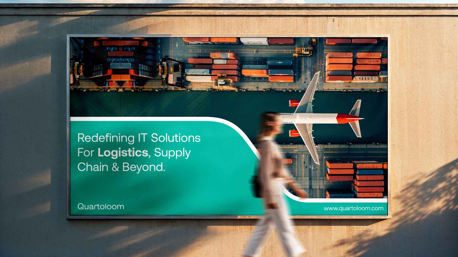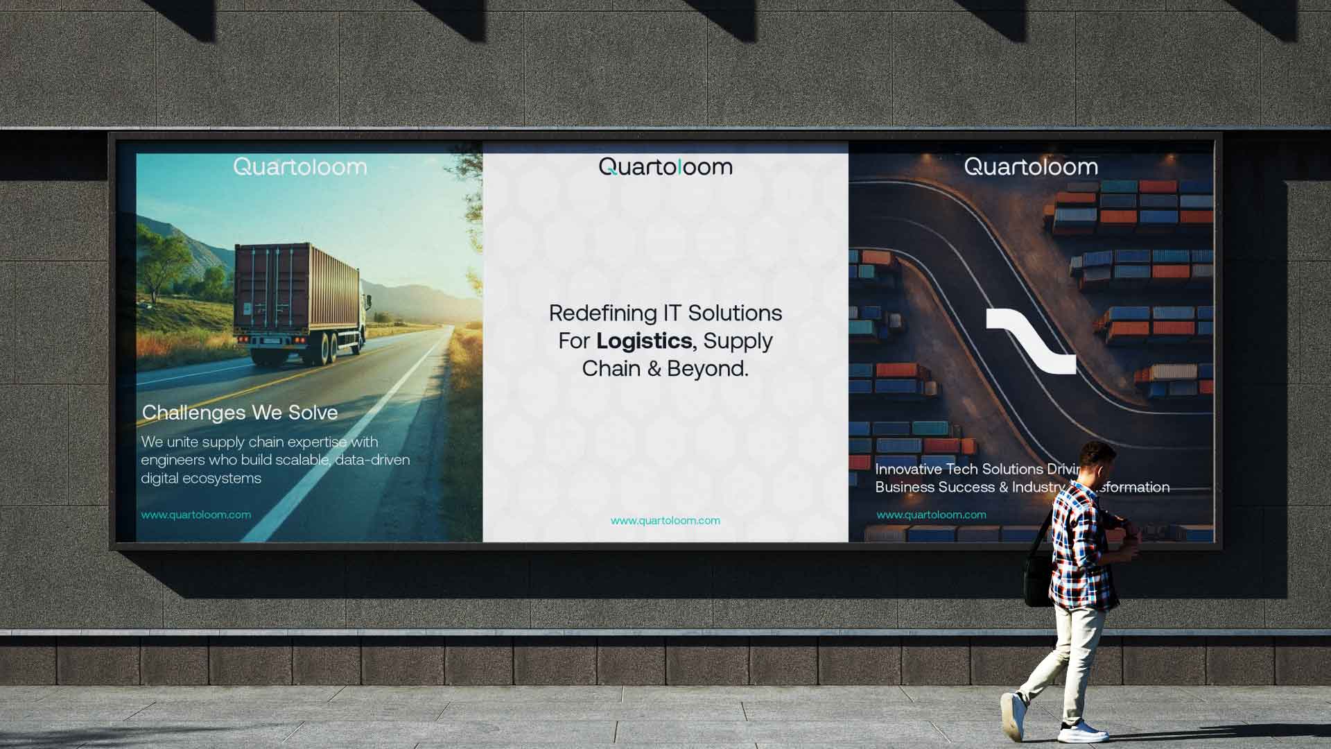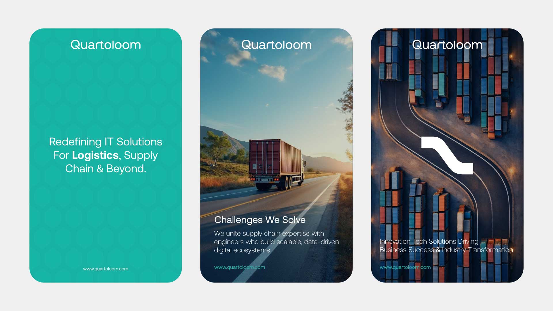 Bold, minimal typography ensures clarity across applications, while the use of logistics-focused imagery paired with digital cues bridges physical operations with intelligent technology. The result is a flexible and scalable identity that presents Quartoloom as a confident and future-ready IT solutions partner.