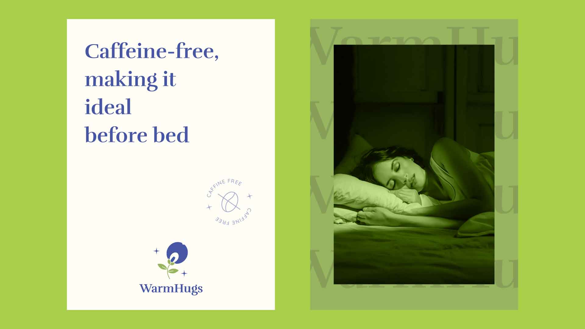 Typography is elegant and understated, allowing the messaging to feel soft yet clear. Statements like “Caffeine-free, making it ideal before bed” reinforce the product’s purpose while aligning with the calming visual tone. Supporting icons and subtle graphic details enhance the sense of authenticity and wellness.