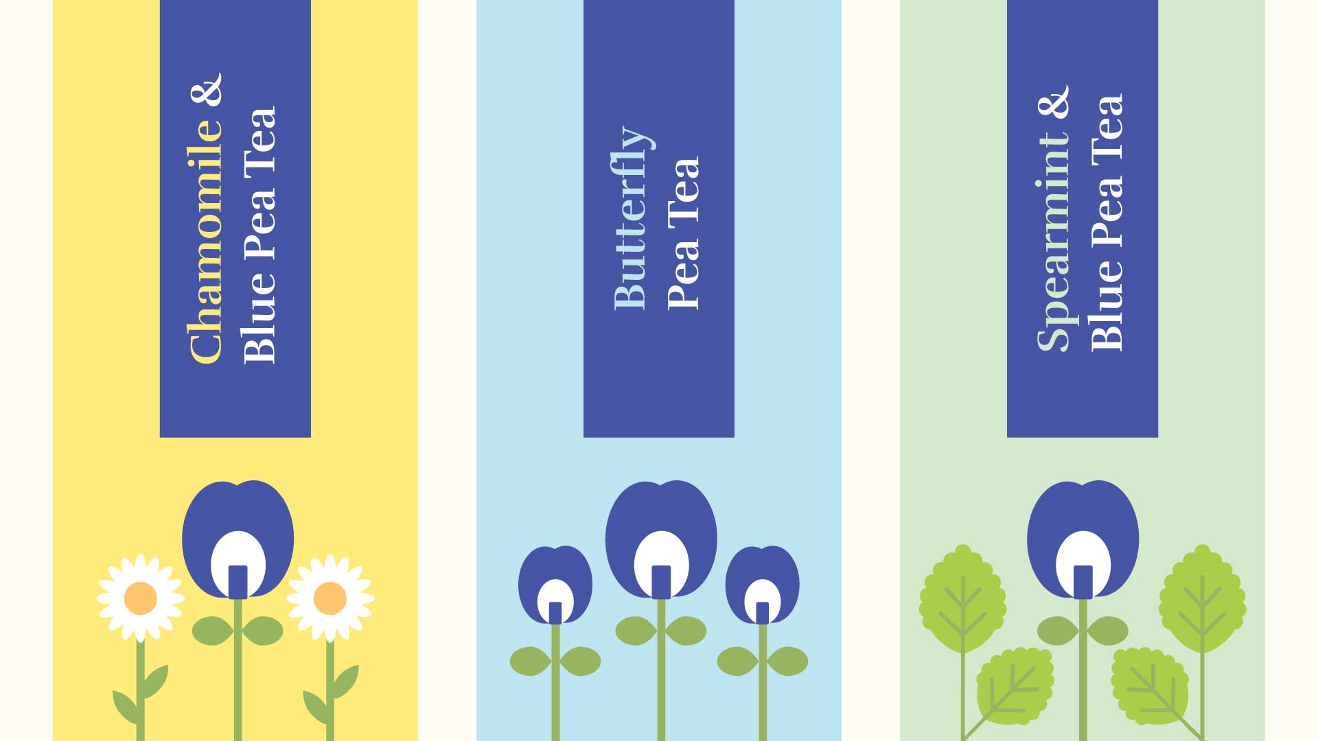 A gentle color palette of greens, blues, and warm neutrals is used to differentiate flavors while maintaining a cohesive and serene brand feel. The floral-inspired illustrations, centered around the blue pea flower and complementary botanicals, add a natural and approachable character to the packaging.