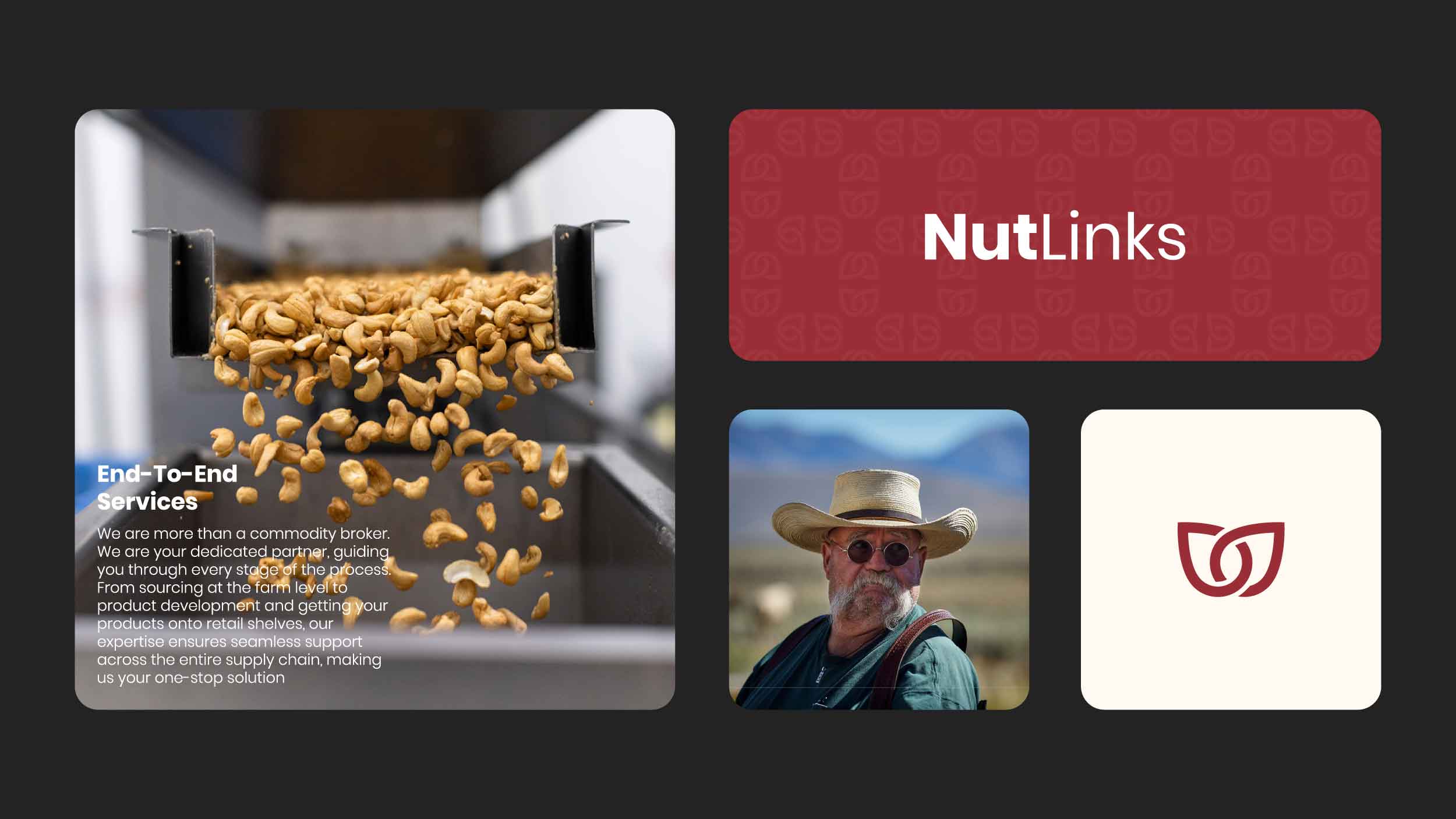 We crafted the Nut Links brand identity to embody their core values of global expertise and trusted partnerships. The centerpiece is the custom logo, which features two connecting nuts to symbolize the vital link between source and partner, representing efficient trade built on over 50 years of combined experience. The rich, deep color palette, anchored by the sophisticated #9A2E36 (a bold maroon/earthy red), provides a sense of professionalism, warmth, and grounded quality. This visual system reflects their boots-on-the-ground visits to nearly 70 countries, projecting a premium, globally aware, and trustworthy image to their partners in the nuts and seeds industry.